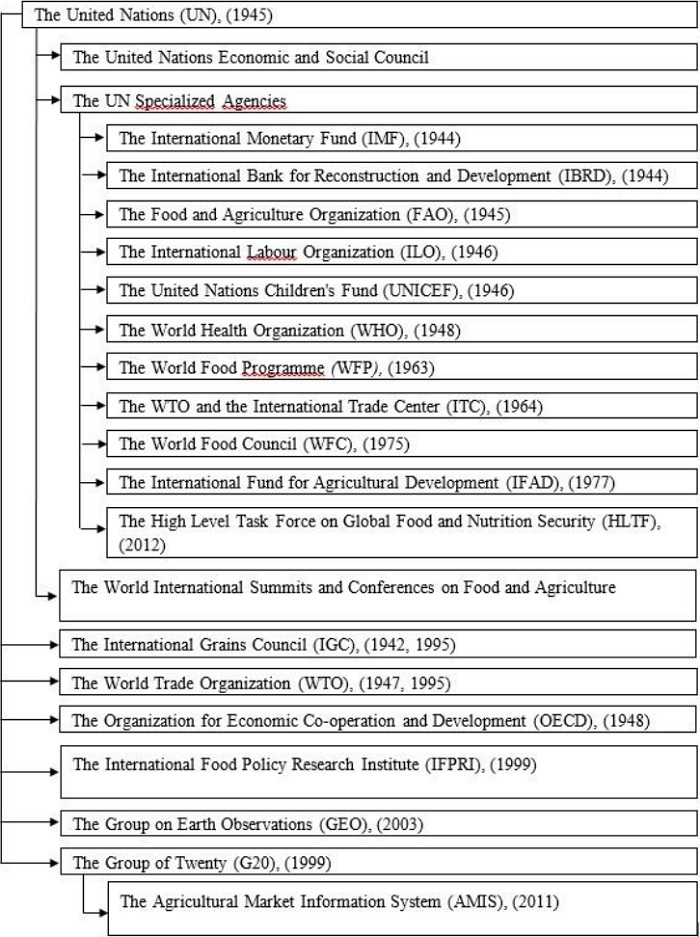 Food security is the most pressing problem of the mankind. The unstable international food market and the inflexible agricultural policy, approved in a number of states, require collective food security measures to be undertaken in the world. Many scientists emphasize that the ongoing processes are determined by economic, political and social factors (Magdy et al., 2012; Moldavan, 2014; Pchelianska, 2017). At the same time, world food security is understood as the preservation of food market stability with the availability of basic foodstuffs for all the countries in the world. It is obvious that the existing socio-economic differences of states (Misselhorn and Hendriks, 2017; Braitstein et al., 2017) make it very difficult to solve the world food security problem. In this regard, international agencies, which performance is directly or indirectly related to food security, as well as the regulatory legal acts, are the most important drivers in this area. Since the formal institutions crystallize the relations (international and national levels) to ground the further food security system architecting, it seems logical to pay attention to international agencies, which performance is directly or indirectly related to food security, as well as to the regulatory legal acts regulating this field (Kolesnikova & Kamasheva, 2017). According to foreign and domestic scientists, globalization is a mechanism that promotes the development of links between the national food security systems. There should be developed a universal mechanism with communication systems that would contribute to the world food security, which should be improved in terms of regulation.