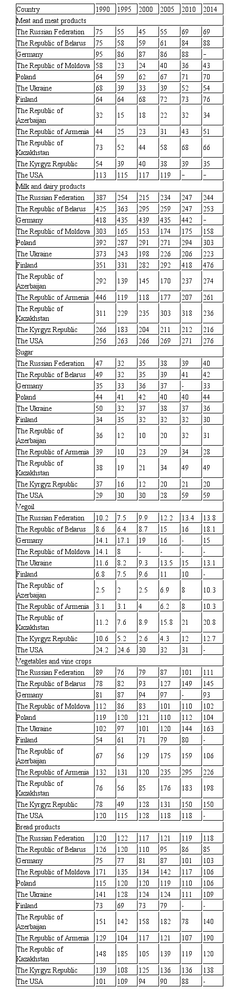 A comparative analysis of the basic food consumption per capita per year in Russia and abroad has allowed us to identify the countries with the maximum and minimum consumption by the main product groups for the period of 1990-2014 (Table 1).