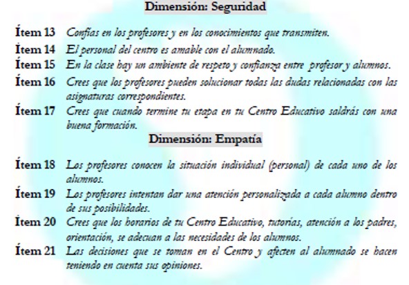Para demostrar las hipótesis de partida en esta investigación se ha utilizado una batería de instrumentos de medida validados por otros investigadores. Dichos instrumentos se han elegido también por su fácil reproducción, asequibilidad y comprensión por parte de la población objeto de estudio. Las escalas de medida se describen en los siguientes epígrafes, en las que se pregunta a los alumnos de la ESO (Educación Secundaria Obligatoria) cómo perciben el servicio educativo prestado y el desarrollo del proceso de enseñanza-aprendizaje en estas aulas.