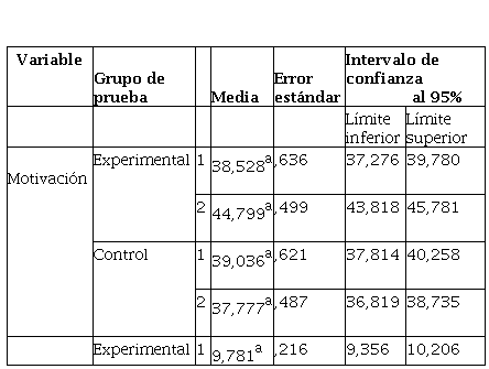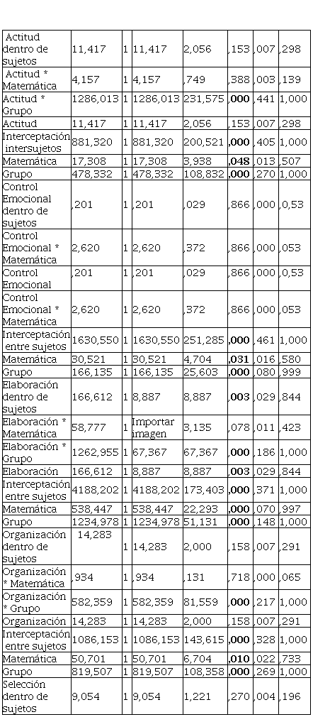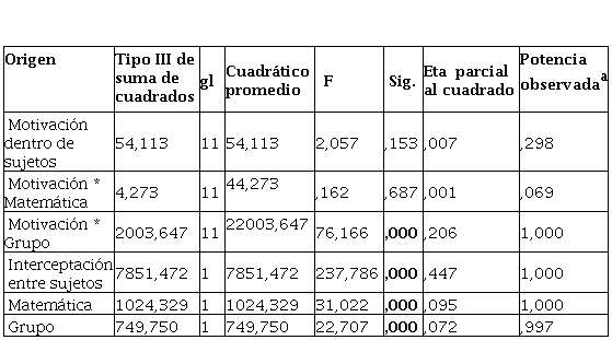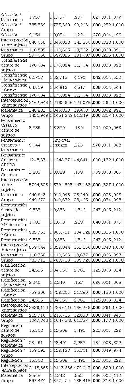 The variance was measured using the ANCOVA covariance to reduce heterogeneity, for this the average in mathematics was used. The results show significant differences for all variables in favor of the experimental group in the post test.
