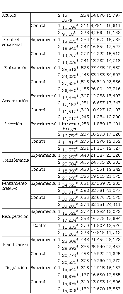 Para verificar lo mencionado, los resultados de la variable promedio en Matemática indican que la varianza es homogénea (p=,439). Al existir diferencias significativas entre los dos grupos (experimental y control) de la fase pre (p=,000), se utilizará esta variable en los ANCOVAS siguientes para ver como covarían los resultados en estrategias de aprendizaje en función de los resultados en Matemática, lo cual, puede ser evidenciado en la siguiente tabla: