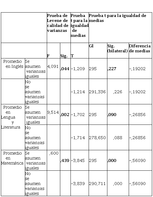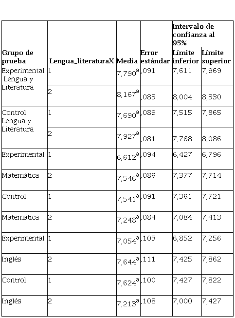 Importar imagenRespecto a las covariables de las asignaturas seleccionadas para este estudio (Lengua y literatura, Matemática, Ingles) se observa que, en el grupo experimental ha mejorado de la fase pre a la fase post con una media ( ) mayor. De la misma manera, existe una mejoría en Lengua y Literatura en el grupo control de la fase pre con una media menor a la fase post; sin embargo, empeora en matemática e inglés. Tal como se muestra en la siguiente tabla: