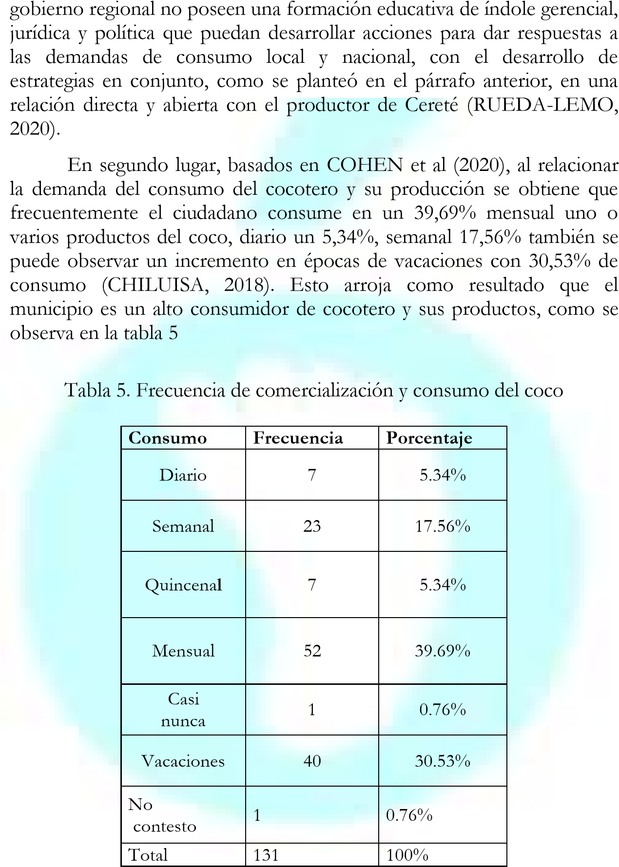 TENORIO-CHILA, J. 2017. Estudio de caso: Análisis de la producción de derivados del coco con perspectiva de exportación en la ciudad de Esmeraldas. Pontificia Universidad Católica del Ecuador, Sede Esmeraldas, Facultad de Ciencias Administrativas. Disponible en: https://repositorio.pucese.edu.ec/bitstream/123456789/1440/1/ TENORIO%20CHILA%20%20JOSELYN%20ROMINA.pdf Consultado el: 22.02.2021