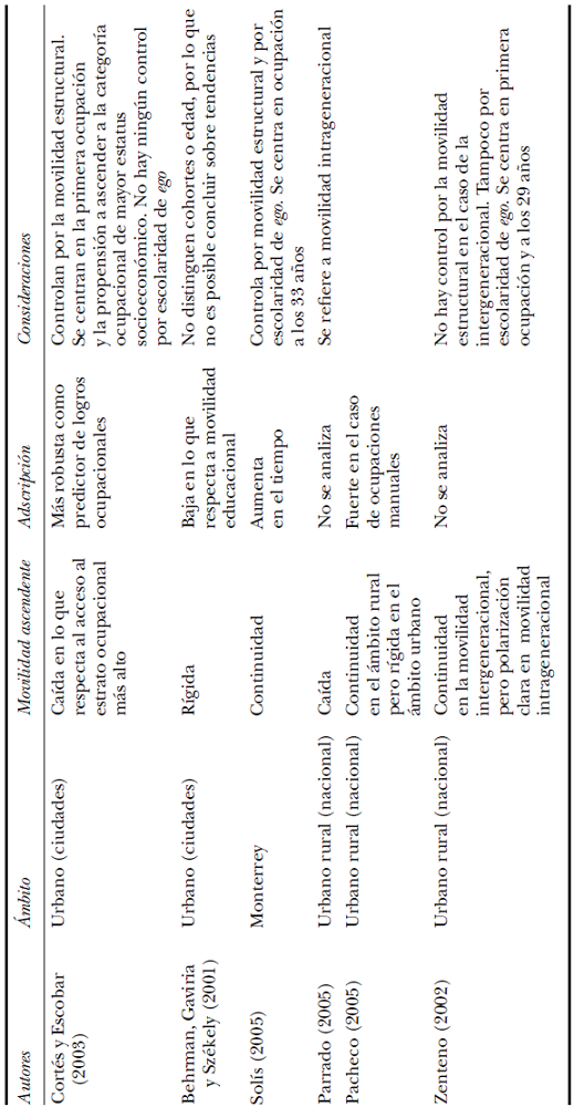 Como se dijo antes, durante las décadas de los sesenta y setenta se realizaron estudios que permitieron identificar los patrones de movilidad social en México durante la industrialización por sustitución de importaciones. No obstante, pocos esfuerzos sistemáticos recientes han contribuido a entender los cambios en la movilidad social -tanto estructural o absoluta como relativa- asociados a las transformaciones económicas y sociales del último cuarto de siglo. Uno de estos trabajos es el estudio de Solís (2002) para la ciudad de Monterrey. Dos de sus conclusiones fueron las siguientes: