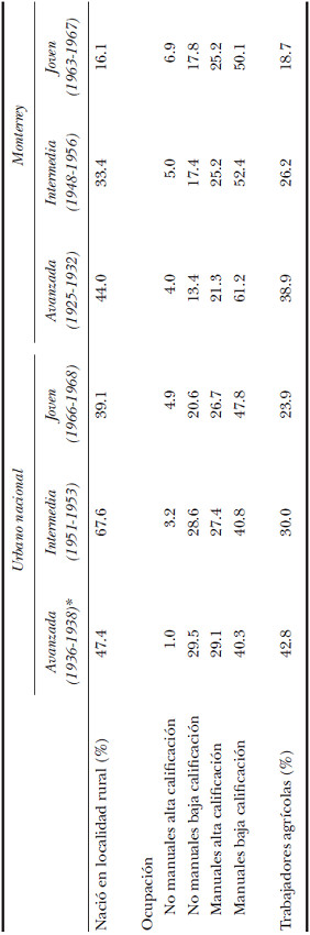 Al observar la cohorte intermedia dos resultados llaman la atención. Por un lado, las oportunidades ocupacionales de los padres mejoraron de manera notable en Monterrey, mientras que en el ámbito nacional hubo pocos cambios. No obstante, la estructura ocupacional de los padres siguió siendo favorable a la población urbana nacional. Por el otro, la continuidad de la estructura ocupacional entre los padres de las generaciones avanzada e intermedia a escala nacional debe evaluarse de manera positiva dado el incremento de la migración rural urbana. Es decir, si bien la proporción de padres inmigrantes rurales se incrementó en la cohorte intermedia, esto no se reflejó en un deterioro de sus oportunidades ocupacionales, lo que refleja que los inmigrantes rurales tuvieron mayores oportunidades de movilidad ascendente, particularmente porque lograron mantener una inserción significativa en ocupaciones no manuales de baja calificación.