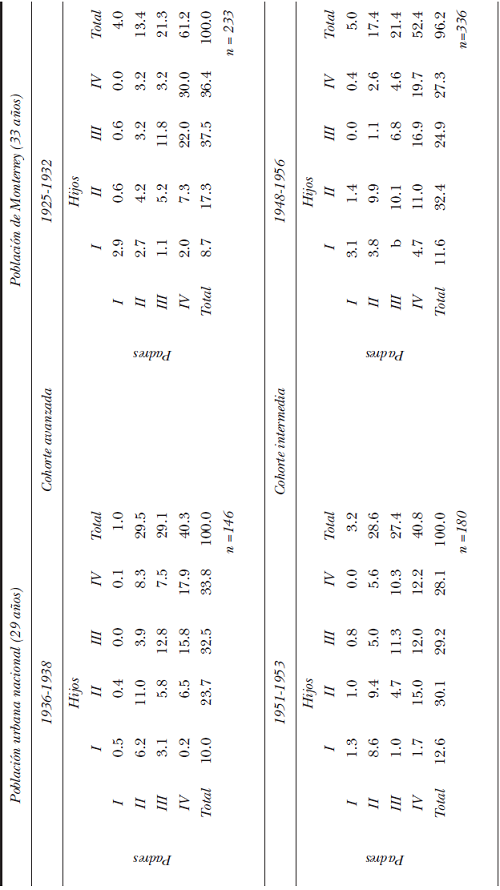 Entre los miembros de la cohorte joven, la proporción de padres que nació en localidades rurales disminuyó significativamente a 39%. Sin embargo, esta cifra fue alta en relación con los padres de la cohorte joven de Monterrey. El origen rural de los padres de las cohortes nacionales no fue un obstáculo para que éstos se insertaran en forma exitosa en los mercados de trabajo urbanos. Al comparar las cohortes avanzadas, los padres del conjunto urbano nacional se beneficiaron de una mejor estructura ocupacional que los padres de los residentes regiomontanos; esto a pesar de la mayor presencia de padres de origen rural en el primer grupo que en el segundo.
