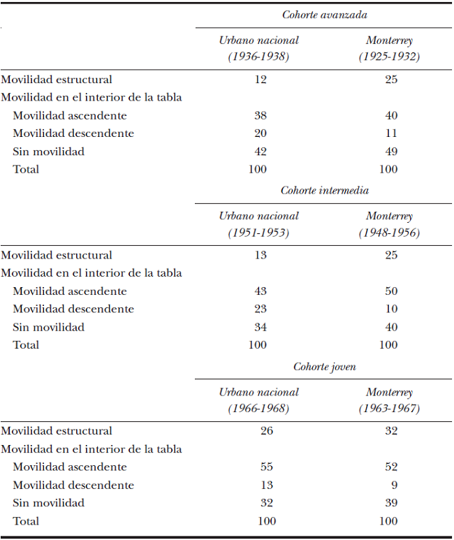 La mayor movilidad intergeneracional tiene un doble rostro en el contexto urbano del país. Por un lado, en todas las cohortes existieron contingentes importantes de hijos que experimentaron un descenso ocupacional en comparación con sus padres. La cifra más alta fue en la cohorte intermedia en donde casi uno de cada cuatro miembros sufrieron un descenso social. La movilidad descendente fue siempre más alta en el ámbito nacional que en Monterrey. Por el otro, la movilidad ascendente fue en aumento en el contexto nacional, al igual que en Monterrey. Sin embargo, Monterrey siempre mantuvo altas tasas de movilidad social ascendente.