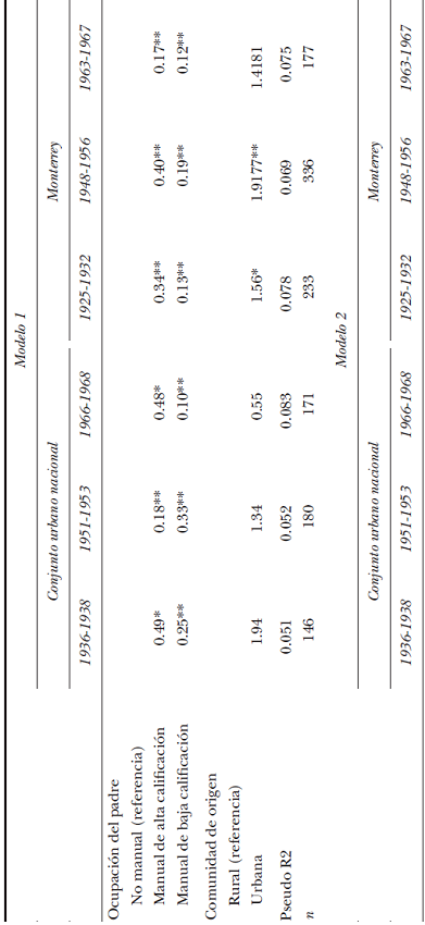 En resumen, a pesar de que una mayor proporción de los padres de las cohortes nacionales contaba con antecedentes rurales en relación con los de Monterrey, los primeros encontraron mejores oportunidades ocupacionales que los segundos. Una posible explicación a este fenómeno es el impresionante auge económico y social que experimentó la Ciudad de México durante los años cincuenta y sesenta. En las cohortes avanzada e intermedia la distribución de los padres se concentró más en ocupaciones manuales de baja calificación en Monterrey que en el contexto urbano nacional. Esta diferencia prácticamente desapareció entre los padres de la cohorte joven, principalmente como consecuencia del deterioro de la estructura ocupacional de los padres de la cohorte joven nacional, lo cual podría estar asociado a un incremento relativo del empleo industrial de baja calificación. Así, la proporción de individuos cuyo padre tuvo una ocupación no manual de baja calificación en la cohorte joven es similar en ambos contextos (47.8% en el nacional urbano frente a 50.1% en Monterrey).