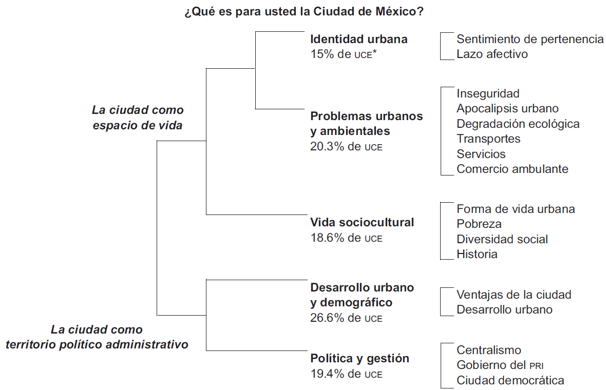Volviendo a la raíz del árbol, vemos que la representación de la Ciudad de México se construye a partir de dos tipos de discursos que reflejan diferentes niveles de construcción simbólica, como una graduación que va de la reflexión racional a la expresión del apego emocional al lugar de pertenencia. Esta polarización de perspectivas respecto a la ciudad indica que las representaciones están marcadas por la perspectiva en que se posiciona el sujeto que la percibe: sea como usuario cotidiano de su espacio de vida o como ciudadano que ocupa un territorio políticamente definido. La muestra de residentes centra su representación de la Ciudad de México en la experiencia urbana, mientras que en la muestra de funcionarios prima la perspectiva del ciudadano con responsabilidades y obligaciones políticas y es determinante su posición como gestores de la ciudad. Ello no implica que estos discursos sean excluyentes, sino que deben verse como dos extremos de un continuo que va desde la esfera personal y afectiva hasta la esfera sociopolítica. El habitante vive la ciudad desde la perspectiva política, aunque no centra en ella su discurso, de la misma manera que el funcionario la experimenta cotidianamente como usuario, pero no ve los problemas urbanos sólo como fuentes de malestar sino como cuestiones relacionadas con las políticas urbanas.