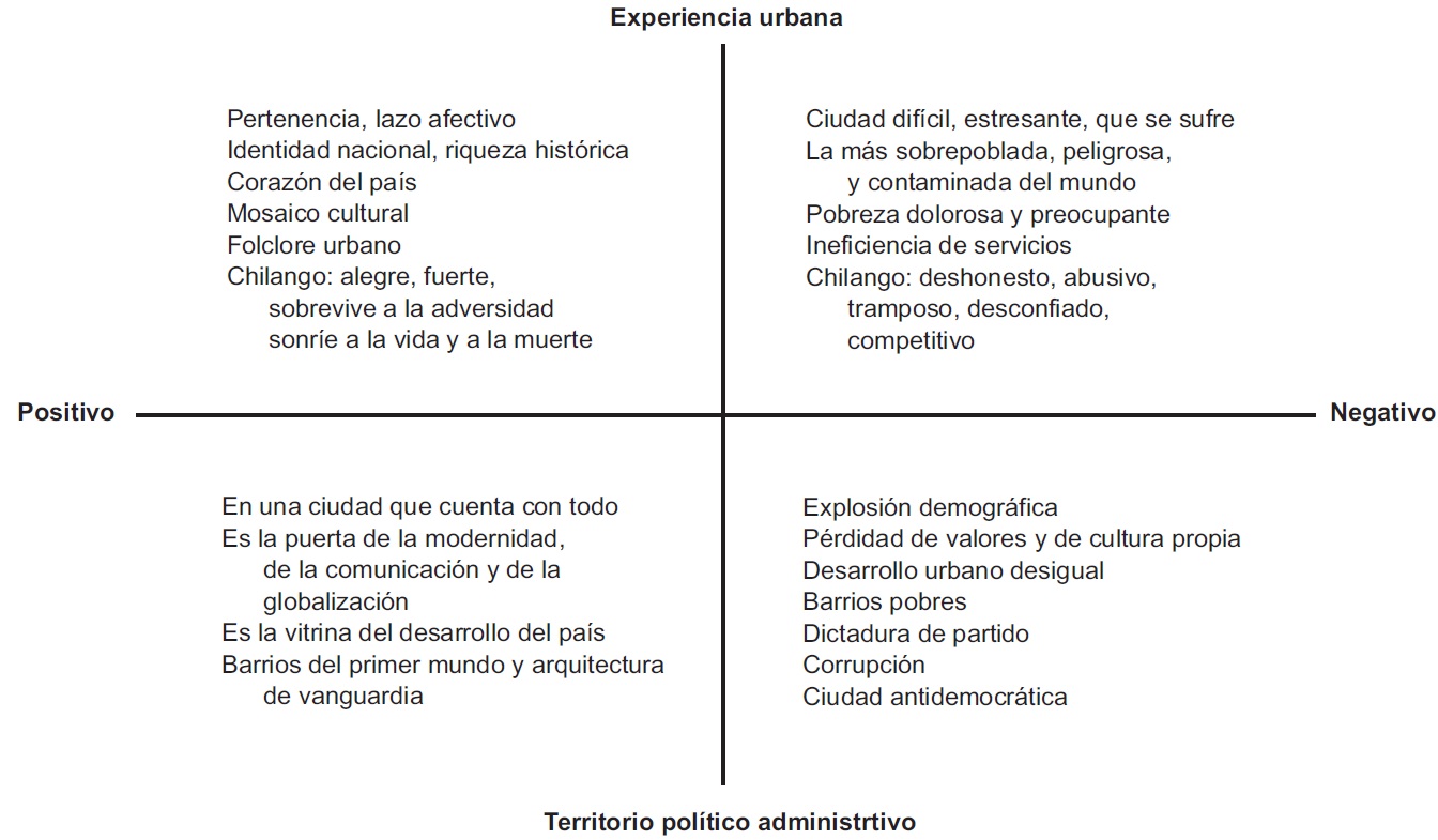 Un análisis más detallado de los contenidos del discurso sobre la ciudad muestra que su representación tiene una estructura más compleja. No sólo se encuentra polarizada entre las dimensiones de la experiencia vivida del espacio y de la política y el desarrollo urbano, sino que existe otro eje que muestra una visión ambivalente de la ciudad que va desde lo positivo hasta lo negativo. En la gráfica 2 se muestra la representación de la ciudad estructurada según estos dos ejes, así como los contenidos del cruce entre ellos. El contenido es una síntesis de los conceptos utilizados por los entrevistados para describir la ciudad.