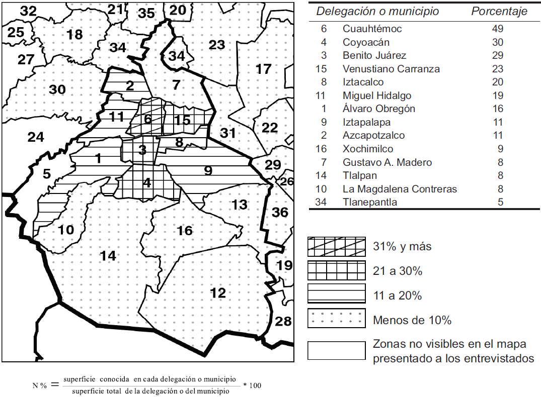 Los entrevistados señalan las zonas que estiman conocer bien en la ciudad, pero de ello no se infiere que desconozcan todo lo que no indicaron como conocido, de ahí que les solicitáramos que marcaran también las zonas que consideran conocer menos de la ciudad. En el mapa 2 se presenta el porcentaje de superficie de cada delegación y municipio que señalaron como menos conocido.
