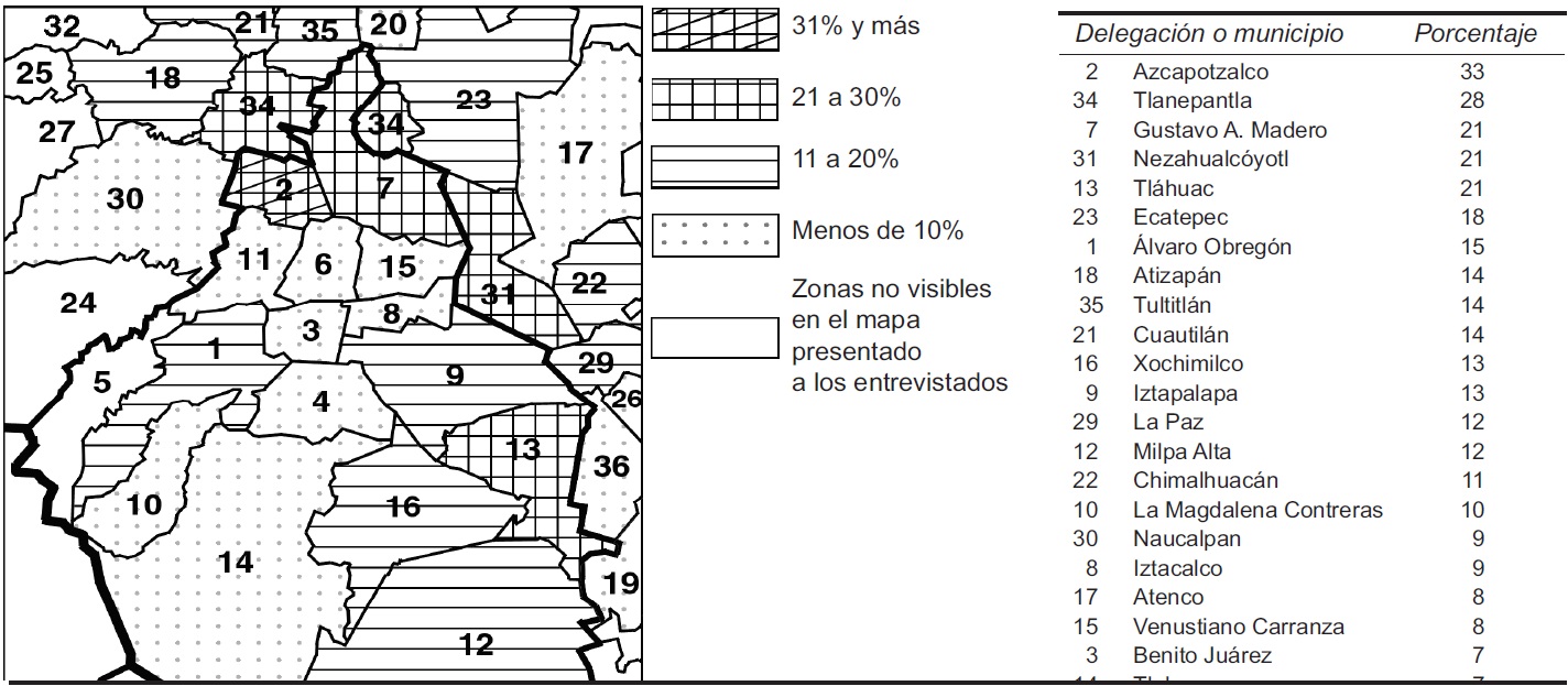 Lo que se estima conocer menos se encuentra en las delegaciones y municipios de Azcapotzalco, Tlalnepantla, Gustavo A. Madero, Nezahualcóyotl, Tláhuac, Ecatepec, Álvaro Obregón, entre otros. En la lista de porcentajes que presentamos a un costado del mapa 2 se observa que las zonas que los entrevistados estiman conocer menos no son los municipios del Estado de México más alejados del Distrito Federal, sino las delegaciones y municipios que constituyen la periferia inmediata del conjunto de delegaciones mejor conocidas. Al superponer los mapas 1 y 2 se hace evidente que el conocimiento de la ciudad está regido por una lógica que va del centro a la periferia, aunque esta periferia parece limitarse a las zonas limítrofes del Distrito Federal. Tal resultado refuerza el hallazgo de que los mapas cognitivos de la Ciudad de México no comprenden la Zona Metropolitana en su totalidad sino que se restringen a las zonas centrales. Únicamente los municipios del Estado de México contiguos al Distrito Federal se incluyen en la representación, aun cuando se trata de indicar las zonas menos conocidas de la ciudad en general.