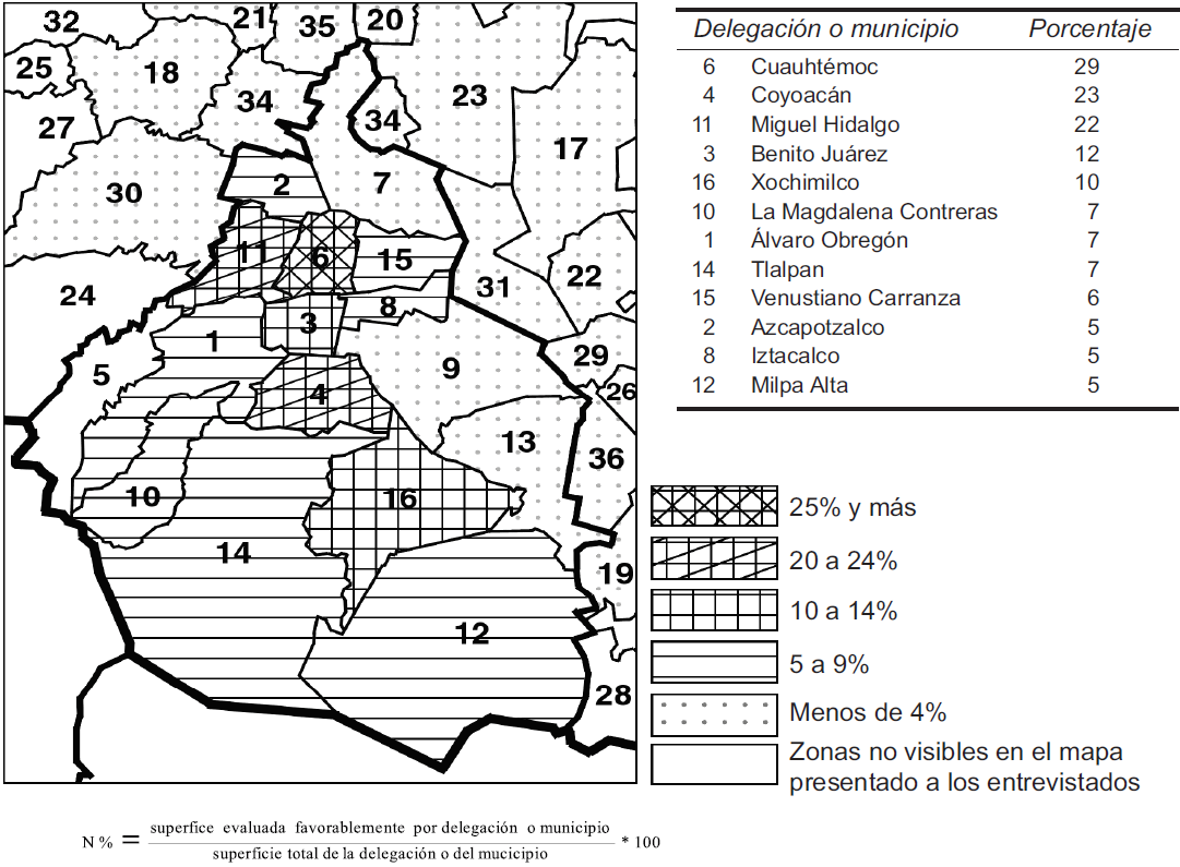 La interrogante que se presenta ahora es saber si las zonas en donde se concentra la representación socioespacial de la Ciudad de México corresponden a los lugares mejor evaluados. En el mapa 3 se presentan los porcentajes del territorio de cada delegación y municipio señalados por los sujetos como las zonas de la ciudad que más apreciaban. Un primer resultado que salta a la vista es que nuevamente la parte más valorada de la ciudad se concentra en tres delegaciones: Cuauhtémoc, Coyoacán y Miguel Hidalgo. Una vez más se reafirma la importancia de estas zonas para la construcción de las representaciones cartográficas de la Ciudad de México. También se observa la exclusión de los municipios del Estado de México en los mapas cognitivos de la urbe. Ello está sin duda relacionado con el hecho de que nuestros entrevistados frecuentan poco las zonas periféricas de la ciudad, pues todos residen en el Distrito Federal. Sin embargo, no deja de ser notable que al pedirles que realicen mapas de la Ciudad de México o que evalúen las zonas que la componen, no conciban la mancha urbana en su totalidad, sino sólo la parte que corresponde al Distrito Federal. Cuando incluyen a los municipios conurbados se trata únicamente de aquellos que se incorporaron a la mancha urbana en los años setenta (Negrete, Graizbord y Ruiz, 1993), pero en sus mapas imaginarios no consideran que los municipios que se han incorporado desde entonces formen parte de la Ciudad de México.