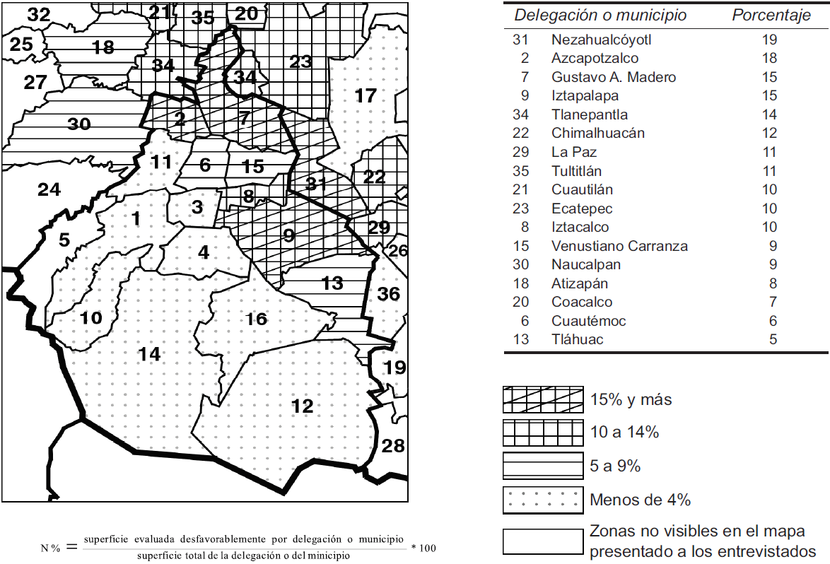 Las zonas mejor evaluadas de la Ciudad de México se ubican en el suroeste de la Zona Metropolitana, mientras que las menos apreciadas se ubican en el noreste, como se puede apreciar en el mapa 4. En él se presentan las proporciones de superficie evaluada desfavorablemente por los entrevistados en cada delegación o municipio: 19% de Nezahualcóyotl, 18% de Azcapotzalco, 15% de Gustavo A. Madero y de Iztapalapa. Las razones de rechazo que dieron los entrevistados en su evaluación negativa de algunos lugares de la Zona Metropolitana coinciden en cuatro aspectos: carencia de servicios urbanos y culturales; un espacio de vida inconveniente (zonas industriales, contaminación, falta de vegetación, tráfico abundante, etc.); la condición social desfavorecida de los residentes de la zona; y la inseguridad. Estas características se atribuyeron a todas las zonas que los entrevistados no aprecian, aunque a algunas más que a otras; por ejemplo, Nezahualcóyotl fue considerada una zona de alta pobreza, carente de servicios urbanos básicos (agua, limpieza, drenaje, etc.) e insegura. La inseguridad es menos importante para Nezahualcóyotl que para Iztapalapa, en donde se menciona como primer criterio de rechazo, mientras la pobreza y la falta de servicios son secundarias.