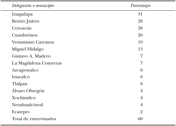 Para saber si las representaciones corresponden a las prácticas del espacio indagamos sobre los lugares que frecuentan los entrevistados de manera general con diversos fines, así como los que son inevitables para ellos, como los de residencia, trabajo y estudio. También se les pidió que señalaran en un mapa de la zona metropolitana las áreas que estiman conocer más y menos en la Ciudad de México, y que indicaran cuáles apreciaban más y cuáles menos. Dada la gran variedad de sitios precisos señalados, decidimos analizarlos por zonas más generales, como las delegaciones y los municipios de la zona metropolitana. En el cuadro 1 se presentan los porcentajes de sujetos que viven, trabajan o estudian en las delegaciones y municipios. En el cuadro 2 se especifican los porcentajes de lugares que los entrevistados dicen frecuentar en cada delegación o municipio.