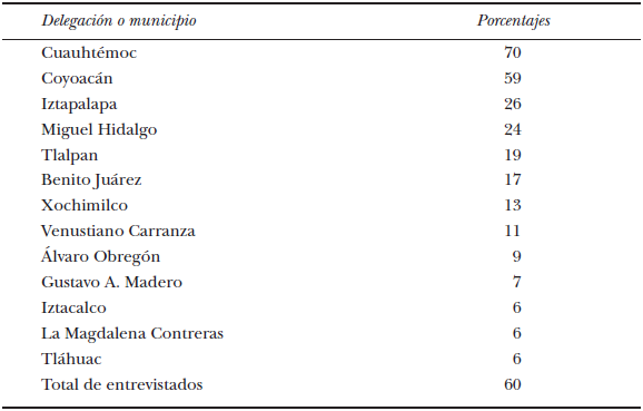Entre 25 y 31% de los entrevistados tiene nexos con las delegaciones Iztapalapa, Benito Juárez, Coyoacán y Cuauhtémoc porque viven ahí, por motivos de trabajo o de estudio. Una proporción menor, entre 13 y 19%, va a las delegaciones Venustiano Carranza y Miguel Hidalgo por estos motivos. Entre 6 y 7% vive, trabaja o estudia en las delegaciones Gustavo A. Madero, La Magdalena Contreras, Azcapotzalco, Iztacalco y Tlalpan. Muy pocos de ellos, de 2 a 4%, se relacionan con las delegaciones Álvaro Obregón y Xochimilco o con los municipios Nezahualcóyotl y Ecatepec. La muestra estuvo integrada únicamente por personas residentes en el Distrito Federal,8 por lo que se observa que son muy pocos los entrevistados (3) que trabajan y estudian en los municipios conurbados del Estado de México. Por otro lado, cuando se pide a los entrevistados indicar los lugares de la ciudad que visitan con más frecuencia ya no mencionan ningún municipio del Estado de México ni las delegaciones Cuajimalpa y Milpa Alta, lo cual indica que sus principales actividades de entretenimiento o vida social se llevan a cabo principalmente en la zona central del Distrito Federal. Las delegaciones Cuauhtémoc y Coyoacán son las más frecuentadas. De acuerdo con algunos estudios que examinan la oferta cultural en la ciudad (García Canclini, 1998), las delegaciones Cuauhtémoc, Miguel Hidalgo y Coyoacán concentran el mayor número de equipamientos culturales, lo cual explica que sean las delegaciones más frecuentadas por nuestros entrevistados. Aunque en el caso de los mapas de nuestros entrevistados, el triángulo cultural formado por el Bosque de Chapultepec, el Centro Histórico y la Ciudad Universitaria se extiende hacia Tlalpan y Xochimilco. Cabe advertir que las delegaciones Benito Juárez y Venustiano Carranza suelen frecuentarse principalmente por razones formales (trabajo o estudio) o porque se vive en ellas, pero no por otros motivos. En los mapas cognitivos de la ciudad o en los itinerarios preferidos que se marcaron sobre un mapa, la delegación Benito Juárez aparecía principalmente como una zona de tránsito entre las delegaciones Cuauhtémoc y Coyoacán, principalmente entre sus centros históricos, lo cual indica que probablemente nuestros entrevistados atraviesen esa zona sin detenerse en sus recorridos por la ciudad.