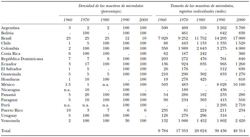 La parte derecha del Cuadro 2 informa del tamaño de las muestras que se integrarán. El número total de casos disponibles entre todos los países parte de aproximadamente 10 millones en la ronda de 1960 y llega a casi 50 millones en la de 2000. Con todos los países y censos integrados, la base de datos completa incluirá aproximadamente 135 millones de casos.