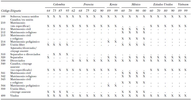 Todas las muestras en América Latina distinguen claramente las uniones libres de los matrimonios legales o civiles, razón por la cual la versión de la variable estado matrimonial para América Latina incluirá en su primer dígito un código para las uniones libres. El sistema de acceso a los datos recomendará, por defecto, esta versión de la variable, a no ser que el usuario haya especificado previamente su interés por comparar datos entre regiones.