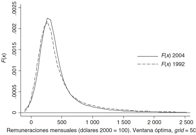 En la gráfica 1 se muestran las estimaciones de las densidades empíricas de las remuneraciones de los trabajadores en su conjunto entre 1992 y 2004. Puede parecer que los cambios distribucionales no han sido relevantes, sin embargo se aprecia que la distribución ha sufrido un desplazamiento hacia la derecha, específicamente en la parte que se halla apenas por encima de la media total de las remuneraciones entre ambos años (511 y 525 dólares respectivamente), y se observa que la moda de la distribución es más pronunciada en 2004, como señal de un aumento en los ingresos en esa proporción de la población.