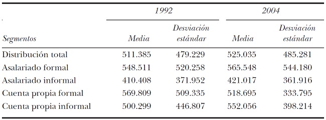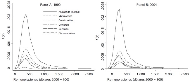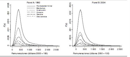De acuerdo con la información, se aprecia que el sector informal mantiene un peso elevado de los trabajadores incluidos en el análisis con hasta 38% en el año 2004, del cual 22.9% lo representan los trabajadores por cuenta propia y el restante 16% los asalariados. Esta información refleja que considerando ceteris paribus la media de las remuneraciones mostradas en el cuadro 2, en 1992 el sector formal en conjunto percibía una remuneración promedio mayor que el informal y para el año 2004 el trabajador por cuenta propia había aumentado su media casi al mismo nivel que el asalariado formal; sin embargo el análisis de promedios no muestra una fotografía completa de la situación, que sí es posible observar con la desagregación de las densidades, explicando las causas de la distancia salarial entre los grupos de trabajadores para toda la distribución y que la misma se haya ampliado para una gran proporción de trabajadores informales por cuenta propia respecto del resto de categorías.