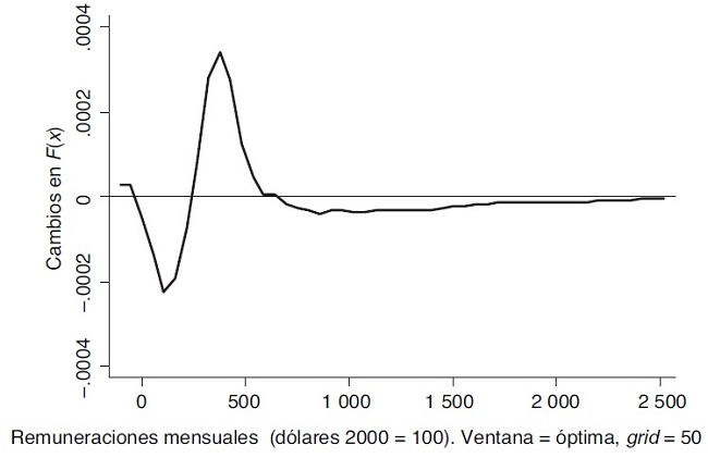 El comportamiento de cambio entre ambos tipos de posición laboral es inverso en relación con el sector, es decir, muestra cambios positivos para los asalariados formales y también para los que trabajan por cuenta propia pero son informales, y en esta última categoría laboral los cambios se asemejan más a los operados en la gráfica 5 de las funciones de densidad de la distribución total.