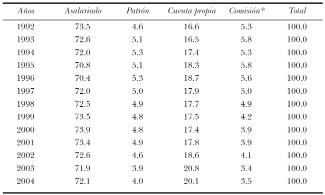 Según la información de las bases de datos de la Encuesta Nacional de Empleo Urbano (ENEU), el mercado de trabajo urbano en México está integrado en mayor proporción por asalariados, con un total de 72% de la población ocupada promedio durante 1992-2004. Como se puede apreciar en el cuadro 1, los trabajadores por cuenta propia representaron el segundo grupo laboral más numeroso en la estructura porcentual, con una participación promedio alrededor de 18%. Los trabajadores por comisión o destajo ocuparon algo menos de 5%, en tanto que los patrones representaron 5% del mercado laboral, y el residual “otras categorías” mostró una participación ocupacional muy reducida.