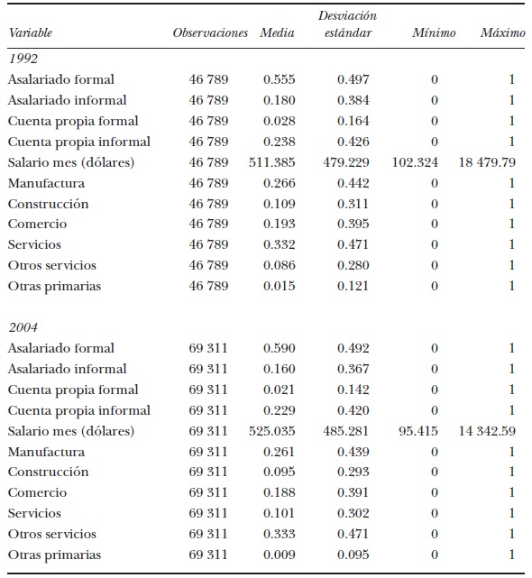 La información que utilizamos proviene de las bases de datos de la Encuesta Nacional de Empleo Urbano (ENEU) para los años 1992 y 2004. Las ENEU desagregan la información de empleo y la de remuneraciones a nivel de microdatos en un panel rotativo (con duración de cinco trimestres); sin embargo para el trabajo empírico solamente emplearemos la información al segundo trimestre con el propósito de crear un corte transversal que sea representativo para detectar los cambios en el periodo de análisis.