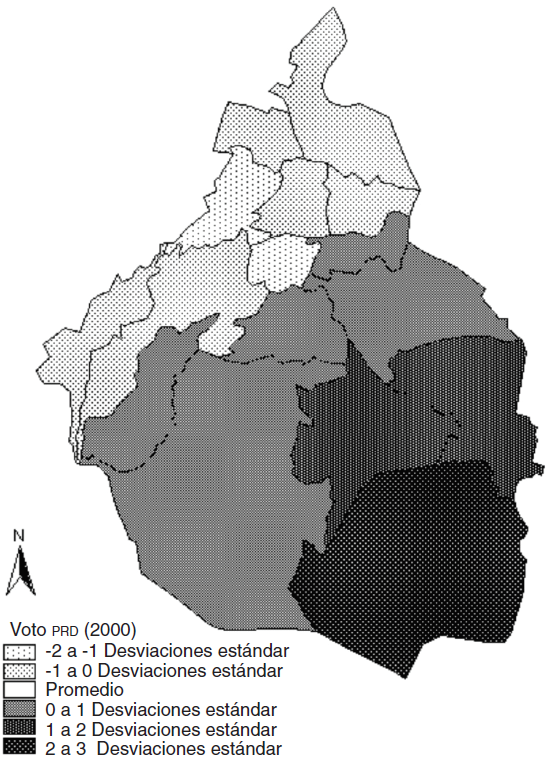 El análisis espacial realizado aquí ratifica las tres tesis anteriores y agrega las dos siguientes: 1) que en la Ciudad de México la Alianza por el Cambio (APC)3 y el Partido de la Revolución Democrática (PRD) se excluyen geográficamente, y 2) sus resultados fueron altamente dependientes de la segregación espacial socioeconómica en la ciudad, si bien la Alianza es más espacialmente dependiente que el PRD.4 La implicación de estos hallazgos para futuras elecciones es que si la división entre ricos y pobres en la Ciudad de México aumenta, y en consecuencia también lo hace la segregación espacial socioeconómica, esto tendrá el efecto de dividir geográficamente aun más a la ciudad en sus preferencias partidistas.