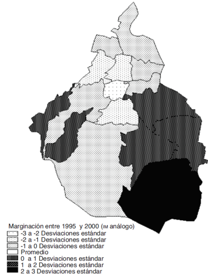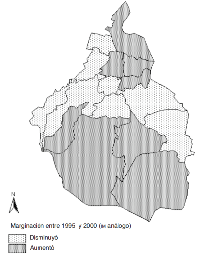 Sobre el cambio entre 1995 y 2000, destacan los resultados estadísticamente significativos de las delegaciones Cuajimalpa y Tláhuac. En el primer caso, la delegación Cuajimalpa es la central de un conjunto de delegaciones que redujeron en similitud con ella sus niveles de marginación durante ese periodo. Particularmente se trata de las delegaciones de Miguel Hidalgo y Álvaro Obregón, las cuales poseen de hecho niveles de marginación que están por debajo del promedio de la ciudad y van en progresivo descenso. La conclusión que arroja el CAEL es que Cuajimalpa es una especie de isla de baja marginación y en proceso de mejora en el interior de la Ciudad de México.