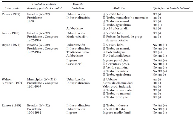Dados sus antecedentes modernistas, en la geografía electoral mexicana es posible ver el amplio uso de variables descriptivas de la modernización y por ende de la urbanización y la industrialización. Este uso de la modernización es múltiple, pero en esencia repetitivo si se observa al detalle. Cabe agregar que en el balance estas variables han mostrado ser efectivamente capaces de explicar las variaciones geográficas en los resultados electorales de México en los distritos electorales, municipios, ciudades, sistemas de ciudades y entidades federativas (véase el cuadro 1). Los resultados de los partidos políticos que con más frecuencia se han analizado son los del Partido Revolucionario Institucional (PRI), el Partido Acción Nacional (pan) y el Partido de la Revolución Democrática (PRD).12