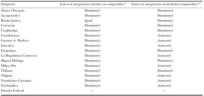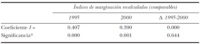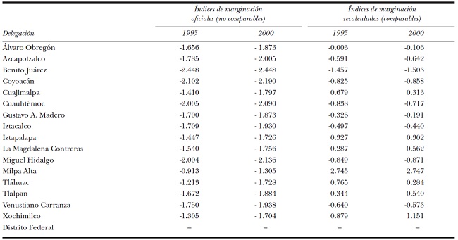 El cuadro 8 muestra los índices de marginación oficiales no comparables y los índices ad hoc comparables de 1995 y 2000.40 Estos índices se utilizan como mediciones de segregación socioeconómica. Los cambios en los índices de marginación para el periodo 1995-2000 se muestran en el cuadro 9. Nótese que los índices oficiales de 1995 y 2000 contienen variables diferentes para cada año, por lo que la comparación es inválida. En cambio el índice recalculado contiene las mismas variables para 1995 y para 2000, por lo que la comparación entre ambos años es válida.