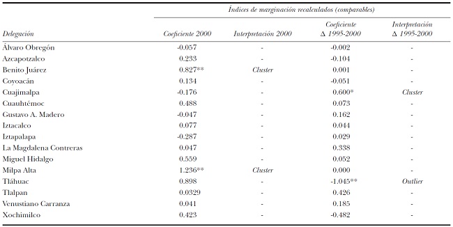 Para el año 2000 destacan los resultados de una concentración -clustering- estadísticamente significativa de delegaciones con baja marginación alrededor de la delegación Benito Juárez, y de delegaciones con alta marginación alrededor de Milpa Alta, de mayor magnitud en esta última.