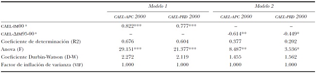 En el primer modelo la variable independiente (VI) son los coeficientes de autocorrelación local de los índices de marginación recalculados para el año 2000 (CAEL-im00). O sea, mediciones de segregación espacial específicas para el año 2000. En el segundo modelo la variable independiente (VI) son los coeficientes de autocorrelación local (CAEl) de los índices de marginación recalculados para el cambio entre 1995 y 2000 (cael-Dim95-00). O sea, mediciones del cambio en la segregación espacial para el periodo 1995-2000. Ambas variables independientes representan mediciones de la segregación espacial en cada delegación respecto al promedio de la ciudad.