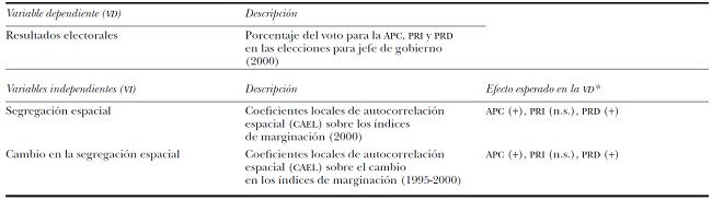 Como variable dependiente (VD) se utilizan como información base los resultados de la elección para jefe de gobierno de la ciudad en el año 2000.27 Como variable independiente (vi) se utilizan como información base los niveles de segregación espacial en el año 2000 y el cambio en los niveles de segregación espacial entre los años 1995 y 2000. Sobre la información base de todas las variables se elaboran coeficientes estadísticos espaciales que posteriormente se convierten en mediciones relevantes para el análisis (véase el cuadro 2). Este procedimiento se explicará a continuación.