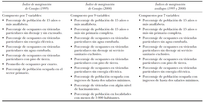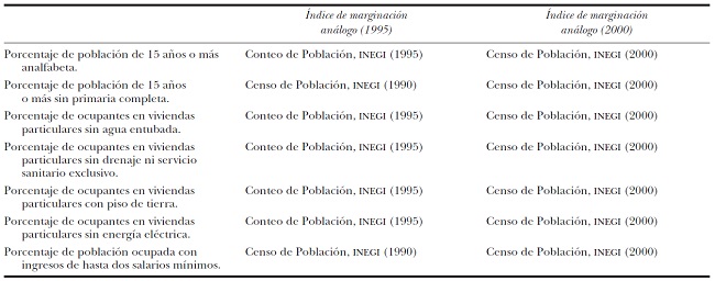 Los índices de marginación oficiales de 1995 y 2000 fueron elaborados con un número diferente de variables. En este estudio fue indispensable rehacer o recalcular los índices para hacerlos comparables entre ambas fechas y poder obtener una razón de cambio válida para el periodo.28 El recálculo siguió la misma metodología estadística diseñada por el Consejo Nacional de Población (Conapo), con la virtud de que los índices recalculados poseen el mismo tipo y número de variables para cada año y por lo tanto son comparables.