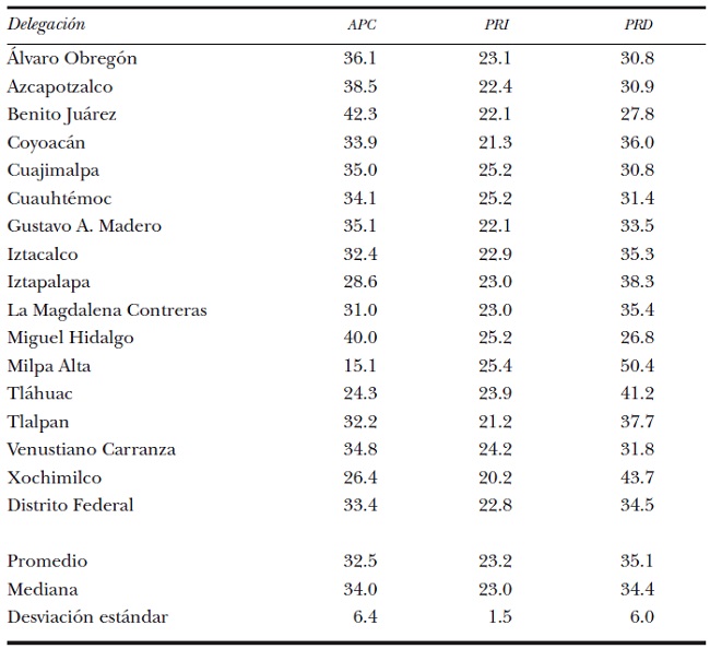 El cuadro 5 muestra los resultados de la elección para cada partido por delegación. El PRD obtuvo la victoria en la ciudad con 34.5% del voto total, la APC alcanzó 33.4%, y el PRI se quedó atrás de ambos con 22.8%. Cuando revisamos el promedio del voto y la desviación estándar para el conjunto de las delegaciones observamos que las diferencias entre los partidos empiezan a ser de mayor magnitud, sobre todo para el PRD y la APC. Se advierte que para el PRI la dispersión es mínima, es decir, su voto tiende a ser uniforme en todas las delegaciones de la ciudad.