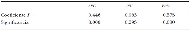 El cuadro 6 muestra los coeficientes de autocorrelación global espacial (CAEG). Los coeficientes globales indican que el voto para la APC y el PRD está concentrado espacialmente; el correspondiente al PRD es el más concentrado (I = 0.575).36 El coeficiente global para el voto del PRI no tiene ninguna significancia estadística (p = 0.293), por lo que se concluye que no posee ningún patrón geográfico y por consiguiente ninguna relación de dependencia o causalidad espacial probable.37