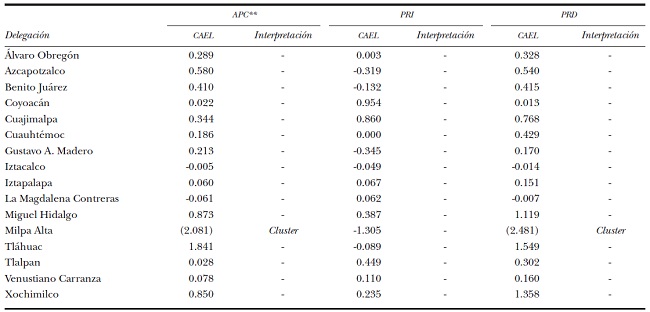 De tales coeficientes se concluye que la APC y el PRD contaron al menos con un cluster espacial o una delegación que se hallaba significativamente por encima o por debajo del promedio de voto en la ciudad. La delegación Milpa Alta -al sur de la ciudad- es la que posee esta característica de cluster espacial para ambos partidos.