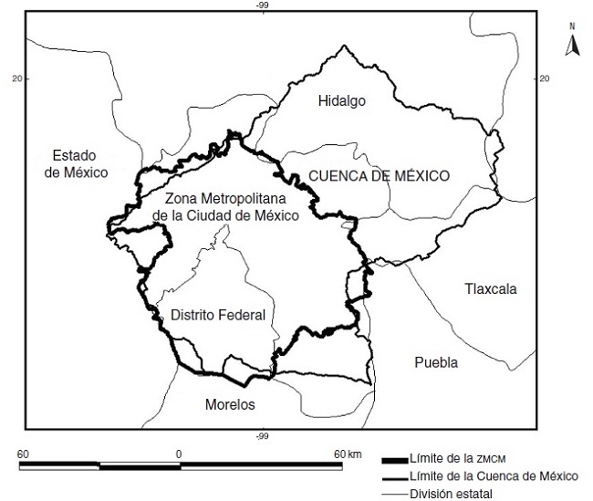Como espacio natural, la ZMCM ocupa toda la parte sur de la Cuenca de México, cuenca endorreica con una superficie de 9 600 km2, ubicada a una altura promedio de 2 240 metros sobre el nivel del mar (MSNM) y rodeada de grandes sierras, cuya altura supera 4 000 msnm. Originalmente esta zona contaba con un sistema de lagos someros cuya composición química era muy particular y que se unían en épocas de lluvia para formar en algunas ocasiones un solo espejo de agua, pero han sido desecados y sustituidos por áreas urbanas durante los últimos seis siglos. Administrativamente, de acuerdo con la Comisión Nacional del Agua de México (Conagua, 2006 y 2008) el territorio de la ZMCM pertenece a la Región Hidrológica Administrativa XIII (RHA XIII) del Valle de México y Sistema Cutzamala, y forma parte de la Región Norte, Centro y Noroeste, cuyo nivel de disponibilidad natural de agua es el más bajo del país, con 1 734 m3 de agua por habitante al año y hasta 89 m3 por segundo en la Cuenca de México, considerando el continuo crecimiento de la población en esta zona.