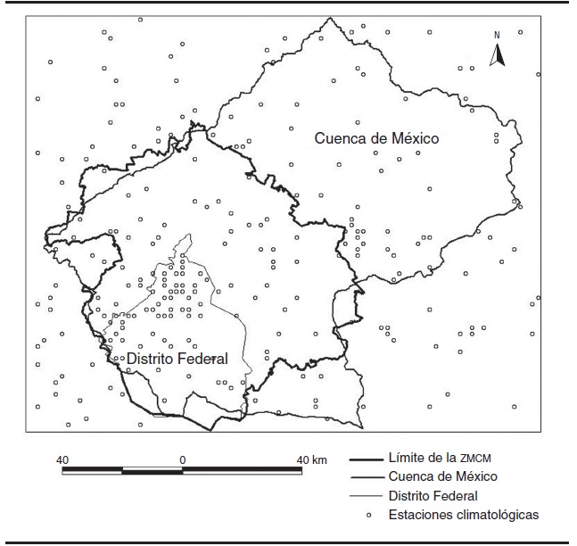 En la Cuenca de México se cuenta con los registros de 193 estaciones climatológicas, de las cuales 99 se encuentran en la ZMCM y 43 en el Distrito Federal (INEGI, 2005). En promedio el área de influencia de cada estación es de aproximadamente 49.7 km2, lo cual está dentro de las normas establecidas por la OMM (Campos, 2007), pero este parámetro no considera la distribución heterogénea de las estaciones por el territorio. En particular hay mayor concentración de las estaciones en el norte y noroeste del Distrito Federal, con poca y hasta nula presencia en otras zonas de la cuenca, lo que puede atribuirse al complicado relieve de la parte sur y a las diferencias en las condiciones económicas, sociales, culturales y de desarrollo urbano en el territorio (véase el mapa 3). A pesar de que algunas de estas estaciones cuentan con el registro y con las series de datos de observación de varios años, ya no están en servicio.