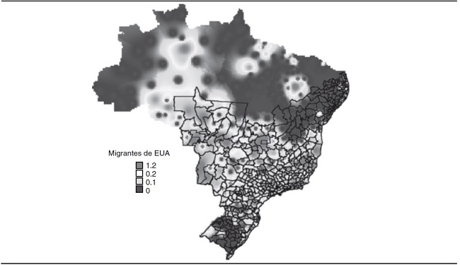 Dada la importancia de las redes sociales, es de esperar que las áreas de migración de retorno de preferencia y el origen actual de la migración internacional sean similares. Por lo tanto, muchos individuos que solían vivir en las primeras áreas ahora radican en el extranjero. Existen millones de brasileños que residen en el exterior (Golgher, 2004) y una proporción razonable regresa a Brasil dentro de un periodo de cinco años. A pesar de esto, los números observados para la migración internacional de retorno son bajos, y de seguro subestimados. Las encuestas elaboradas específicamente para explicar este tema podrían mejorar en buena medida la posibilidad del análisis, el que en la actualidad no se encuentra en el campo de investigación del Censo de Población de 2000.