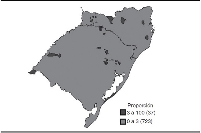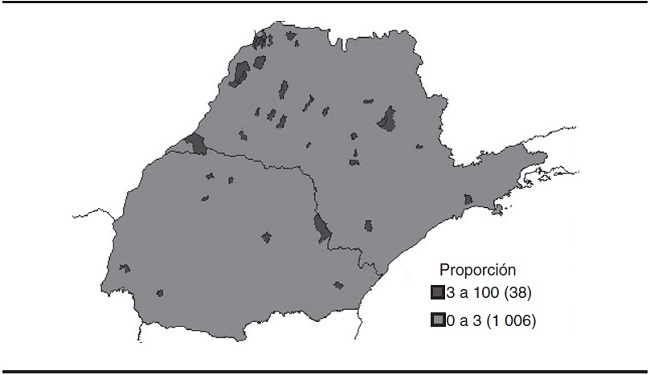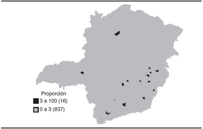 El mapa 4 muestra los resultados para los municipios del estado de Minas Gerais. Existen 16 municipios con una proporción por encima de 3%, todos ellos con una población menor de 20 000 habitantes en el año 2000; seis de éstos están localizados en el centro-este del estado, área de destino de preferencia para los flujos provenientes de Estados Unidos.