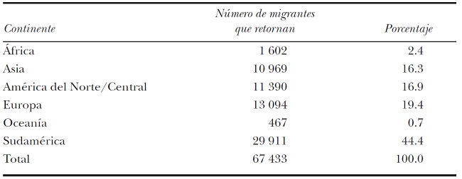 El cuadro 1 muestra el monto de emigrantes por continente de origen. Casi la mitad de éstos eran oriundos de otro país en América del Sur (44.4%), varios en etapas cortas de migración. Asia, América Central y América del Norte y Europa mostraron cifras similares (entre 16 y 20%). los otros dos continentes, África y Oceanía, mostraron un porcentaje mucho menor (2.4 y 0.7%, respectivamente).