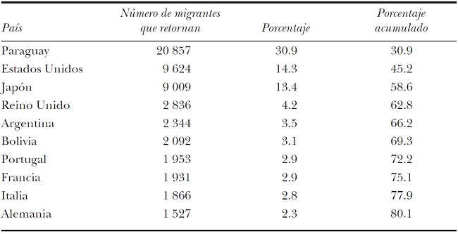 La mayoría de los brasileños regresó exclusivamente de algunos países. El cuadro 2 muestra la magnitud de emigrantes en 10 países con más de 1 000 migrantes de retorno en el periodo 1995 a 2000, los cuales representan más de 80% del total. Sólo Paraguay, Estados Unidos y Japón acumulan más de 58% del total, todos ellos con más de 9 000 migrantes de retorno (estos flujos se explican con detalle más adelante). En cuanto a los demás países del cuadro, cinco pertenecen a Europa y dos a América del Sur, y muestran números entre 1 500 y 3 000 migrantes.