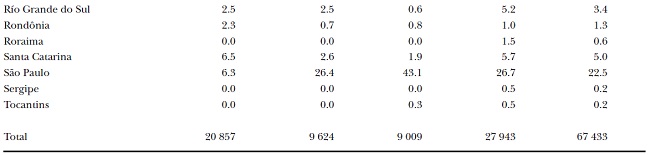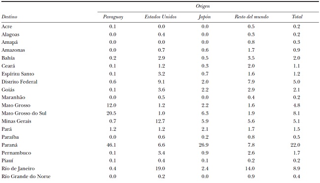 El cuadro 3 muestra la distribución de los flujos de brasileños provenientes de Paraguay, Estados Unidos y Japón y el resto del mundo, en los estados brasileños como destino. Los flujos provenientes de Paraguay tienen como destino de preferencia a los estados cercanos a ese país, como Paraná y Mato Grosso do Sul, y a otros dos estados también cercanos, Mato Grosso y Santa Catarina, con 85% del total. Para los otros dos países estudiados, Estados Unidos y Japón, la distribución de los emigrantes entre los estados brasileños fue muy diferente. Solamente tres estados fueron el destino de alrededor de 58% de los migrantes de retorno provenientes de Estados Unidos: São Paulo, Río de Janeiro y Minas Gerais. Para Japón, cerca de 70% del total de emigrantes se concentró en dos estados: São Paulo y Paraná. Tales distribuciones difieren de las observadas para el resto del mundo, donde aparece una distribución más equilibrada entre los estados.
