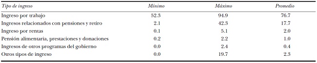 El cuadro 7 muestra algunos datos estadísticos por microrregiones de este tipo de ingresos. Los ingresos por trabajo representaron más de la mitad del ingreso total en todas las microrregiones: entre 52.3 y 94.9% del total, con un promedio por encima de 75%. Los ingresos relacionados con las pensiones y retiro figuran en la segunda categoría en magnitud, con un promedio de 17.7% y un rango de entre 2 y 42%. Las categorías restantes presentan promedios muy bajos, a pesar de que la categoría otros tipos de ingreso tiene un valor máximo significativo. Se hace notar que los valores para pensión alimentaria, prestaciones y donaciones son algo exiguos en el total de las microrregiones, con un promedio de alrededor de 1 por ciento.