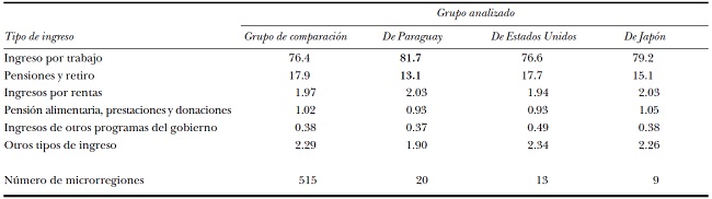 Cuando se efectuó la comparación de las microrregiones con proporciones elevadas de migrantes de Paraguay con el grupo de comparación, se encontró que el primer grupo tiene valores más elevados para los ingresos por trabajo y menores para los ingresos relacionados con pensiones y retiro. Los demás tipos de ingresos no mostraron diferencias en términos estadísticos. El resto de los análisis tampoco muestra ninguna relevancia estadística, esto es, la distribución de ingresos en las diferentes categorías fueron similares entre ellas y el grupo de comparación.
