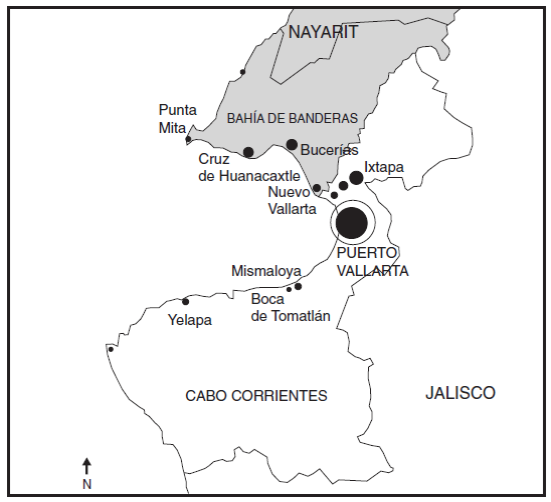 Puerto Vallarta, ubicado en Bahía de Banderas, en la costa norte de Jalisco y en sus límites con el estado de Nayarit, en el Pacífico central mexicano, nació a mitad del siglo XIX como un pequeño puerto asociado a la economía minera. Posteriormente, tras la crisis de la minería vino el auge agrícola y pesquero que pervivió durante la primera mitad del siglo XX, hasta que en los sesenta y los setenta Puerto Vallarta comenzó a sobresalir como un lugar turístico de importancia internacional, visitado principalmente por turistas estadounidenses (Munguía, 1997; Olveda, 1997; Evans, 1981). En la siguiente década el crecimiento de la industria turística fue notable, y en los noventa comenzó a expandirse hacia el norte de la bahía, en territorio nayarita, donde fueron conformándose nuevos complejos de turismo de lujo (Villaseñor, 1997; Del Ángel, 2005; César y Arnaiz, 2004).