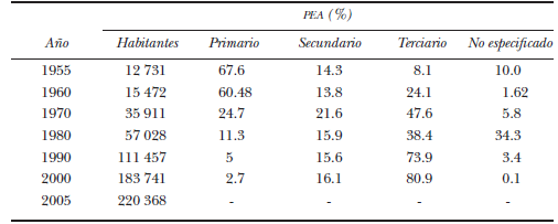 El impulso a la construcción de infraestructura turística y el fortalecimiento de la economía de servicios generaron empleos y atrajeron a una gran cantidad de trabajadores y turistas residenciales. Esto, por supuesto, influyó en la aceleración del crecimiento demográfico y urbano. Para 1970 la población municipal había llegado a casi 36 mil habitantes y en cada decenio se fue duplicando hasta que en el año 2000 llegó a más de 184 mil habitantes. Más de 95% se concentraba en la zona urbana de la cabecera municipal, que en los dos últimos decenios comenzó a extenderse hacia las localidades vecinas, como Ixtapa, Las Juntas, Las Palmas y Mismaloya. Igualmente, la composición de la economía dio un giro importante. Conforme pasaron las décadas se fue reduciendo el sector primario y proporcionalmente fue creciendo el terciario (representado fundamentalmente por el turismo). De esta manera la población ocupada en la agricultura, la ganadería y la pesca, en muy pocas décadas representó una fracción minoritaria, inferior a 3%, mientras que la gente ocupada en la economía de los servicios llegó a más de 80% del total (véase el cuadro 1).