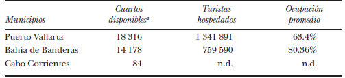 En la actualidad la bahía se encuentra regida por tres municipios, dos pertenecientes a Jalisco: Cabo Corrientes y Puerto Vallarta, y el tercero, llamado Bahía de Banderas, que corresponde a Nayarit (véase el mapa 1). La infraestructura turística de la región está localizada fundamentalmente en los dos últimos municipios, que juntos representan una oferta de más de 32 mil habitaciones (contando cuartos de hotel y de otro tipo) (véase el cuadro 2). Esa infraestructura permite la visita de más de 2 millones de turistas anuales.
